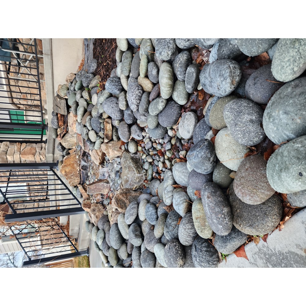 This cobble is a smooth, round, black/gray material with veins of white and brown. Commonly used for xeriscaping, water features, and flower beds. Available in a variety of sizes. Available in a variety of sizes. Note: We recommend seeing current inventory in person for darkness and sizing. The Mexican Beach Pebble line tends to vary in larger size than what it's listed at. We keep the sizing listed to what the supplier and other resellers call it to keep consistency in sizing for this product.